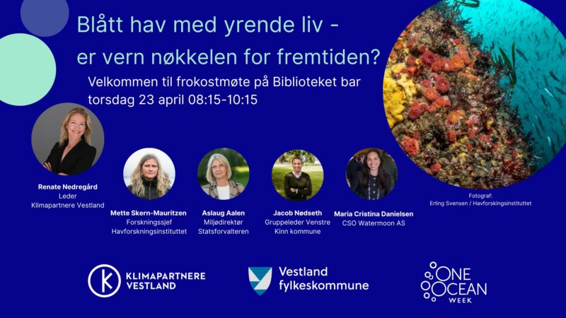Bli med på One Ocean Week, der vi arrangerer et frokostmøte med marint vern som tema. Når vi målet om å bevare 30 % av havområdene gjennom marine verneområder innen 2030? Og hvordan oppnår vi gode, demokratiske prosesser og forankring i kommunene om å få til dette?