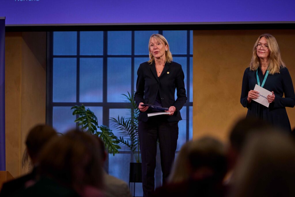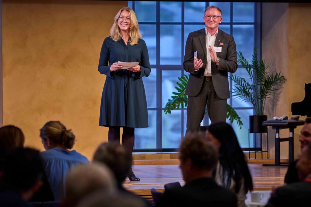 Bård Sandal, direktør for Næring, plan og innovasjon i Vestland Fylkeskommune løftet frem Klimapartnere som et viktig verktøy for å realisere fylkets samfunnsoppdrag: å sette retning, engasjere og samhandle for et framtidsrettet Vestland. Samarbeid på tvers av næringsliv, offentlig sektor, akademia, idrett og kultur er nøkkelen, sa Sandal i sitt innlegg. (Her på scenen sammen med Renate Nedregård, leder i Klimapartnere Vestland)