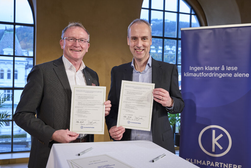 Det ble gjennomført høytidelig signering i Universitetsaulaen på toppledermøtet 16. oktober: Direktør for avdeling for næring, plan og innovasjon, Bård Sandal, signerte på vegne av Klimapartnere, og Vestland Fylkeskommune.